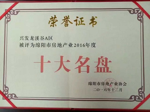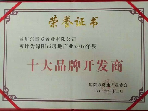 2017年1月16日,绵阳市房地产业协会年会在绵州酒店举行,四川兴事发置业有限公司被评为“2016绵阳十大品牌开发商”,兴发龙溪谷A区被评为“2016绵阳十大名盘”,兴发房产公司被评为“先进单位”,房产公司总经理陈军屹被评为“先进个人”